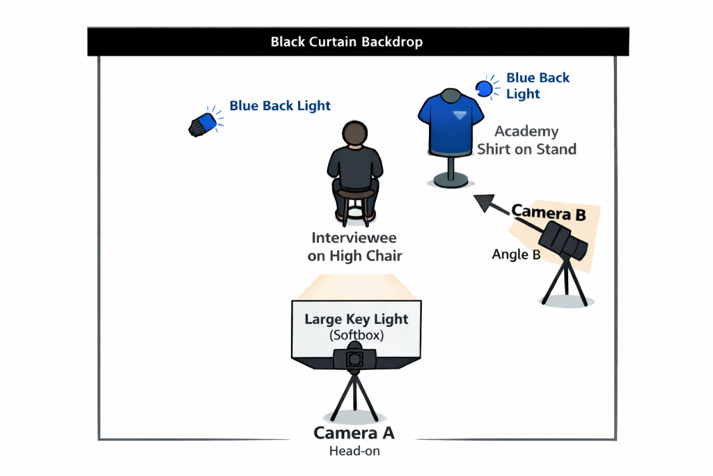 (Positioned behind Camera A, facing the interviewee) - 1 × Blue back light for interviewee
